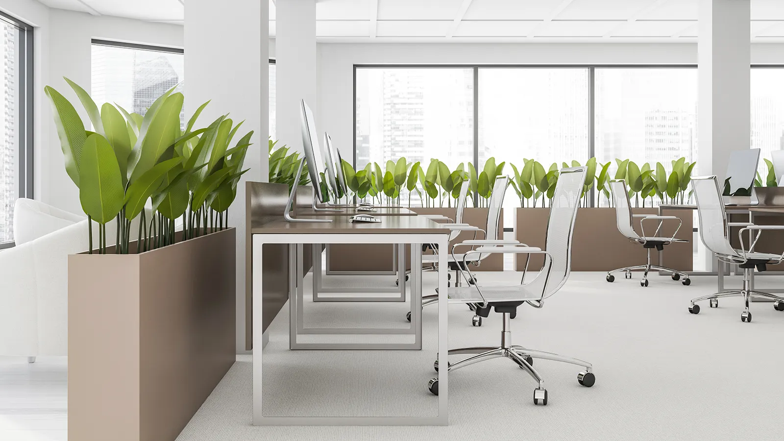 - Integrated Desk Planters: Work with furniture manufacturers to specify desking systems that feature built-in, waterproof plant troughs at the end of each desk run. This ensures that every single employee has immediate, close-up access to nature, enhancing the micro-level interior design with plants.